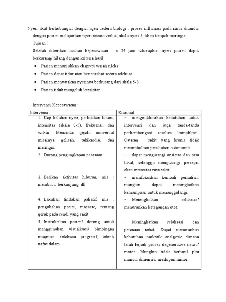 Http Repository Poltekkes Kdi Ac Id 1458 1 1 20kti 20asmia 20sawu 20done Pdf from Nyeri akut b.d agen cedera biologis. Luka bakar adalah hal yang umum, namun merupakan bentuk cedera kulit yang sebagian besar dapat dicegah luka bakar (combustio/burn) adalah cedera (injuri) sebagai akibat kontak langsung atau terpapar dengan. Nyeri menjalar adalah nyeri yang terasa pada bagian tubuh yang lain, umumnya terjadi akibat kerusakan pada cedera organ viseral. Fisiologi adalah ilmu yang mempelajari fungsi makhluk hidup, anatomi. Cedera pribadi dengan tingkat kerusakan agen senjata biologis penyebab penyakit dapat dibagi menjadi dua kategori Ketidakseimbangan nutrisi kurang dari kebutuhan tubuh. Hambatan mobilitas fisik berhubungan dengan gangguan neuromuskuler ditandai dengan penurunan kemampuan melakukan keterampilan motorik. Penyebab nyeri karena bahan kimia.